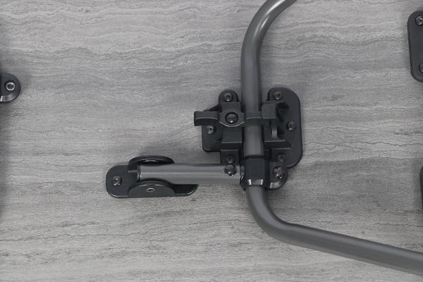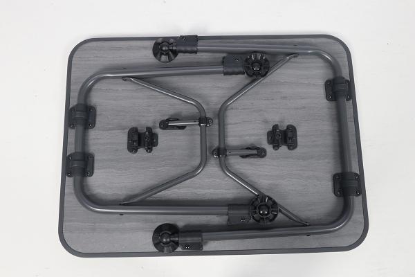 Die Tischbeine sind stufenlos höhenverstellbar von 53 bis 70 cm. Die um 360° verstellbaren Füße sorgen für einen sicheren Stand auf unebenem Untergrund. Für den Transport und die Lagerung lässt sich der Tisch flach zusammenklappen – gefaltet ist er nur 6 cm hoch.