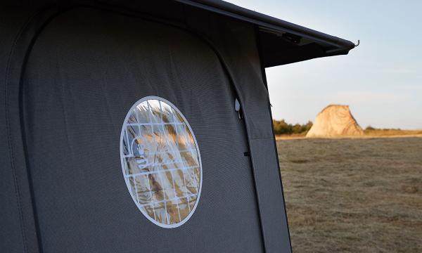 Two large side ventilation windows with mosquito nets, corner door right front, two door options.