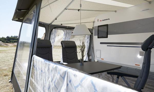 Penta Flint has everything you require from a permanent pitch awning – a depth of 3.5 m without the nuisance of a centre pole, and designed so that every inch of space is used. The material used is Isacryl, which allows the awning to breathe.