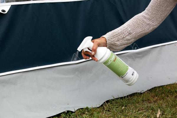 Het product is eenvoudig in gebruik: borstel het oppervlak eerst droog, maak het tentdoek goed nat, spray IsaClean Season rechtstreeks op het doek, borstel met een natte borstel en spoel grondig af met water totdat alle resten zijn verdwenen.